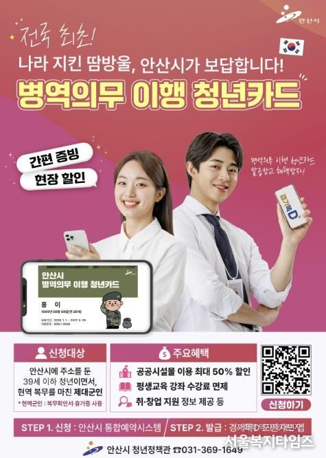 서울복지타임즈 이재연 기자 | 안산시는 내년 1월부터 병역의무를 성실히 이행한 청년을 예우, 지원하기 위해 전국 최초로 ‘병역의무 이행 청년카드’를 온라인으로 발급한다고 22일 밝혔다.