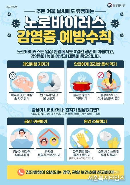 또한 노로바이러스 감염증 환자는 증상이 사라진 이후에도 최소 48시간 동안 등원, 등교, 출근을 자제하고 환자가 사용한 공간과 화장실 등 생활공간을 구분해 사용하는 것이 권장된다.