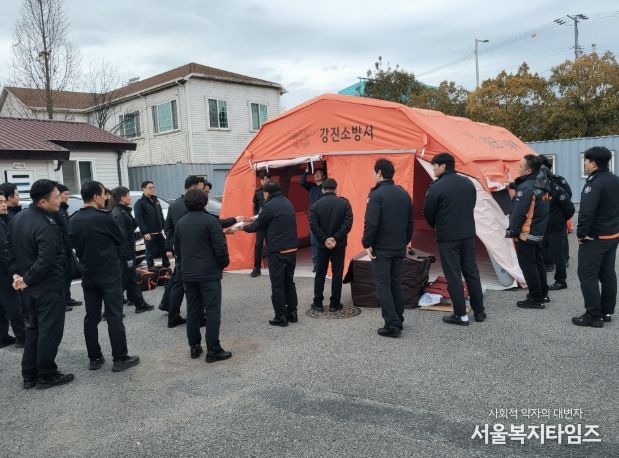 서울복지타임즈 이재연 기자 | 강진소방서(서장 정용인)는 대형 재난 발생 시 신속한 현장 지휘체계 구축을 위해 긴급구조통제단 지휘텐트 등 6종 11점을 새로 도입하고, 이를 활용한 설치훈련을 실시했다고 밝혔다.