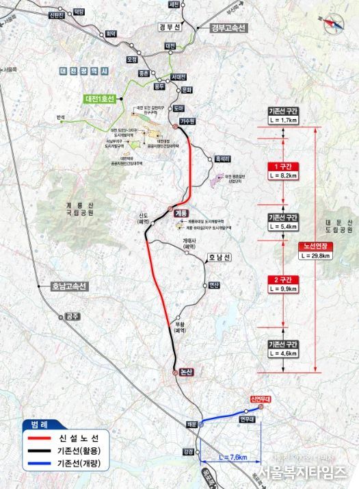 이번 사업은 총사업비 약 9천 2백억원을 투입하여 대전 가수원역에서 논산역까지의 굴곡진 노선을 직선화하고, 기존 노후 시설도 정비하여 250km/h의 고속 주행이 가능한 선로로 개량하는 국책 사업이다.