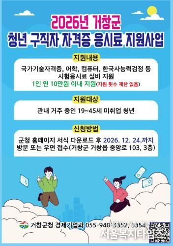 서울복지타임즈 이재연 기자 | 거창군은 미취업 청년의 취업 역량 강화와 경제적 부담 완화를 위해 각종 자격증 시험 응시료를 지원한다.