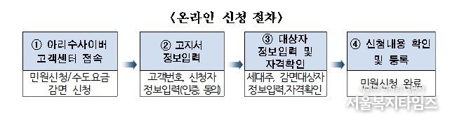 신청방법은 방문신청 또는 온라인신청이 가능하다. 방문 신청은 1월 12일부터 감면받을 주소지 관할 동주민센터에서 우선 접수하며, 온라인 신청은 3월 3일부터 서울아리수본부 누리집 내 아리수 사이버고객센터에서 할 수 있다.