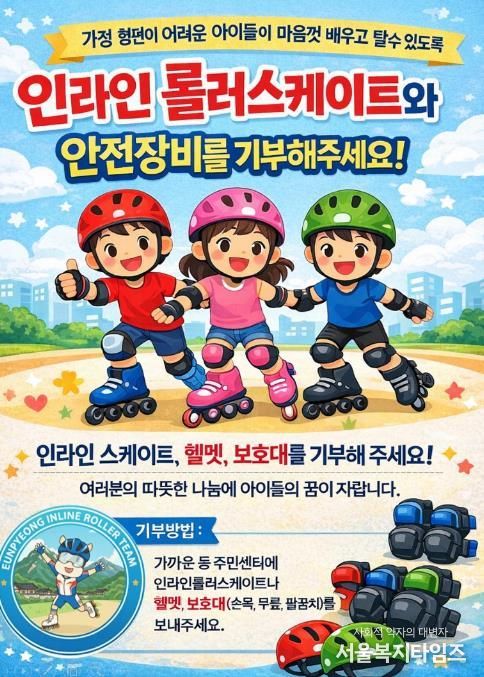 서울복지타임즈 이재연 기자 | 서울 은평구는 가정형편 등으로 체육활동 참여가 어려운 아동을 지원하기 위해 인라인 롤러스케이트 및 안전장비 기부 캠페인을 연중 운영한다고 밝혔다.
