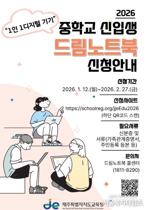 서울복지타임즈 이재연 기자 | 제주특별자치도교육청은 12일부터 인공지능(AI) 대전환 시대를 맞아 도내 학생들의 디지털 학습 역량을 강화하기 위해 중학교 신입생을 대상으로 ‘2026학년도 드림노트북 지원(대여) 사업’ 신청을 받는다.