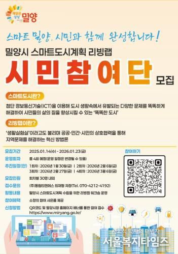 서울복지타임즈 이재연 기자 | 경남 밀양시는 지역 내 다양한 도시문제 해결을 위한 ‘밀양시 스마트도시 리빙랩 시민참여단’을 1월 23일까지 모집한다고 밝혔다.