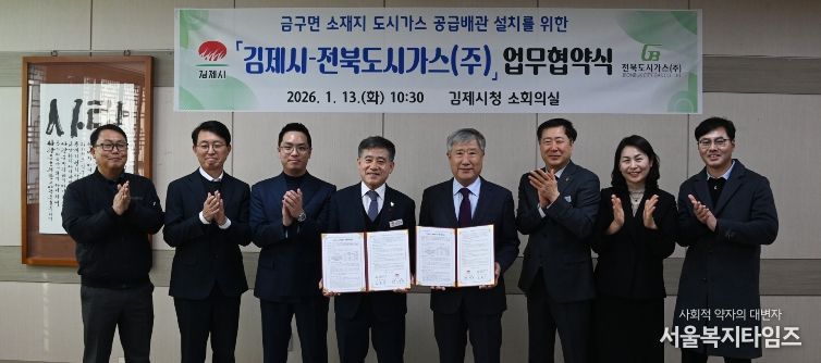 서울복지타임즈 이재연 기자 | 김제시는 전북도시가스 주식회사(대표 김홍식)와 13일 시청 소회의실에서 금구면 주민들의 에너지복지 향상을 위해 도시가스 공급배관 설치사업 업무협약을 체결했다고 밝혔다.