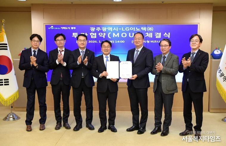 서울복지타임즈 이재연 기자 | 광주광역시와 LG이노텍은 13일 시청 비즈니스룸에서 ‘차량용 제어모듈 신규 생산라인 구축을 위한 투자협약’을 체결했다. 이번 협약은 2026년 새해 부강한 광주로의 힘찬 도약을 알리는 첫 신호탄이다.