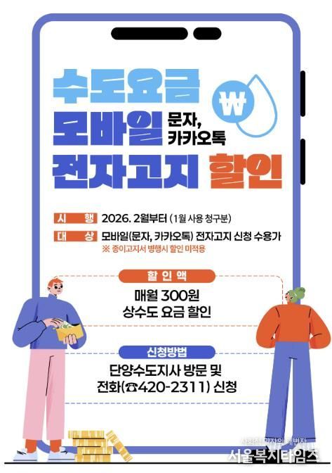 서울복지타임즈 이재연 기자 | 단양군은 종이 고지서 발송에 따른 행정비용과 환경 부담을 줄이고, 군민의 요금 납부 편의성을 높이기 위해 수도요금 모바일(문자·카카오톡) 전자고지 할인 제도를 오는 2월부터 시행한다고 밝혔다.