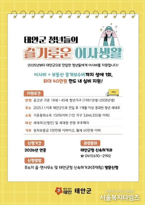 서울복지타임즈 이재연 기자 | 태안군이 청년들의 초기 주거 부담을 낮춰 인구 유입을 활성화하고자 ‘2026년 청년 이사비 지원사업’을 추진하며 청년인구 사수에 나선다.