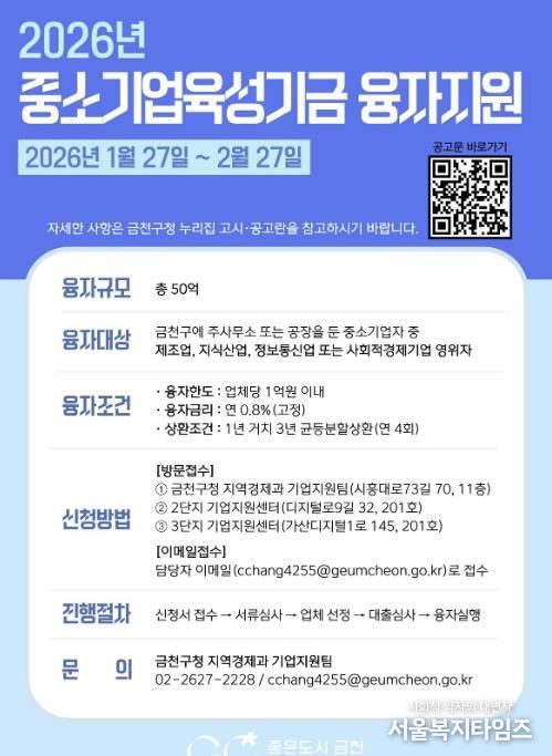 서울복지타임즈 이재연 기자 | 금천구는 자금 운용에 어려움을 겪는 지역 내 중소기업을 지원하기 위해 50억 원 규모의 ‘2026년도 중소기업육성기금 융자지원 사업’을 추진한다고 밝혔다.