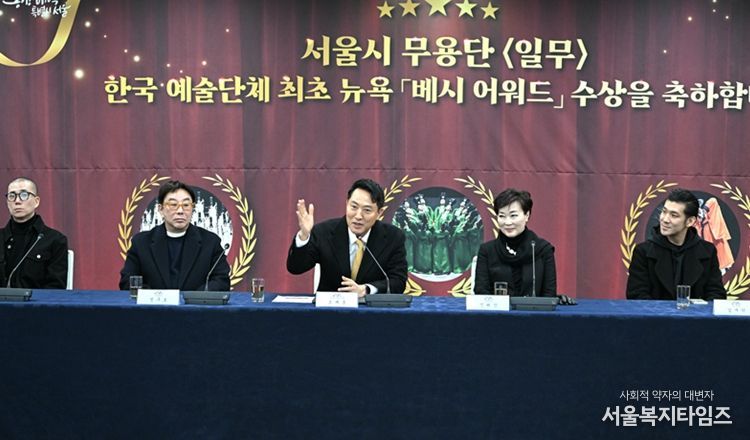 서울복지타임즈 이재연 기자 | 오세훈 서울시장은 문화예술계 인사들과 29일 12시, 서울시청 간담회장1에서 종묘제례악을 재해석한 ‘일무’로 2026년 ‘베시 어워드’에서 최우수 안무가·창작자상을 수상한 서울시무용단을 만나 축하 인사를 전했다.