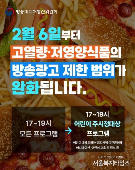 서울복지타임즈 이재연 기자 | ■ 2월 6일부터 고열량·저영양식품의 방송광고 제한 범위가 완화됩니다.