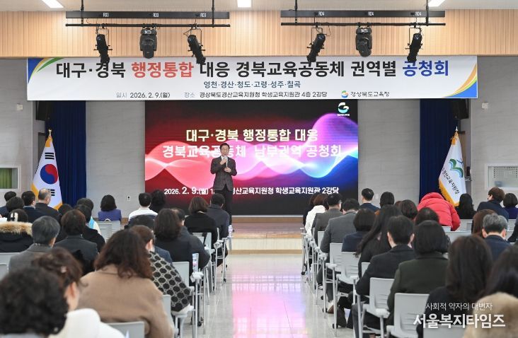 서울복지타임즈 이재연 기자 | 경북교육청은 9일 경산시에 있는 경산교육지원청 학생교육지원관에서 남부권역(경산.영천.청도.고령.성주.칠곡) 교직원과 학부모 200여 명이 참석한 가운데 ‘대구-경북 행정통합 대응 경북교육공동체 권역별 공청회’ 첫 일정을 개최했다고 밝혔다.