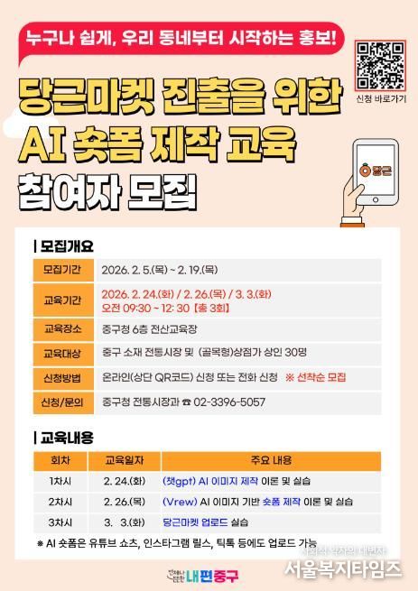 서울복지타임즈 이재연 기자 | 서울 중구가 전통시장과 골목형상점가 상인을 대상으로 '당근마켓 AI 숏폼 제작 교육'을 운영한다. AI를 활용해 짧은 홍보 영상을 직접 만들고, 이를 당근마켓에 게시하는 실습 중심 교육으로, 오는 19일까지 상인 30명을 모집한다. 구는 이번 교육을 시작으로 올해도 상인 역량 강화를 본격 지원한다.
