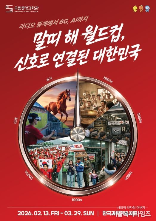 서울복지타임즈 이재연 기자 | 미래의 꿈을 만드는 과학기술 문화 이음터(플랫폼) 과학기술정보통신부 국립중앙과학관은 2026년 병오년(丙午年) ‘붉은 말’의 해와 북중미 월드컵 개최를 맞아 '말띠 해 월드컵, 신호로 연결된 대한민국 : 라디오 중계에서 6세대 이동통신'6G', 인공지능'AI'까지' 특별전을 2월 13일부터 3월 29일까지 한국과학기술사관에서 개최한다고 밝혔다.