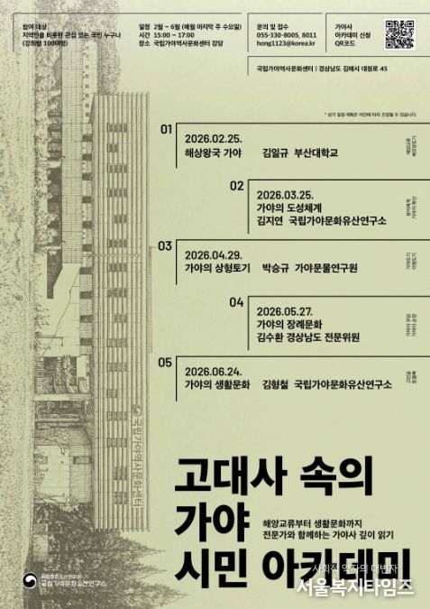 서울복지타임즈 이재연 기자 | 국가유산청 국립문화유산연구원 국립가야문화유산연구소는 2월부터 6월까지 매월 마지막 주 수요일, 국립가야역사문화센터 강당(경남 김해시)에서 시민들을 대상으로 '고대사 속의 가야' 시민 아카데미를 개최한다.