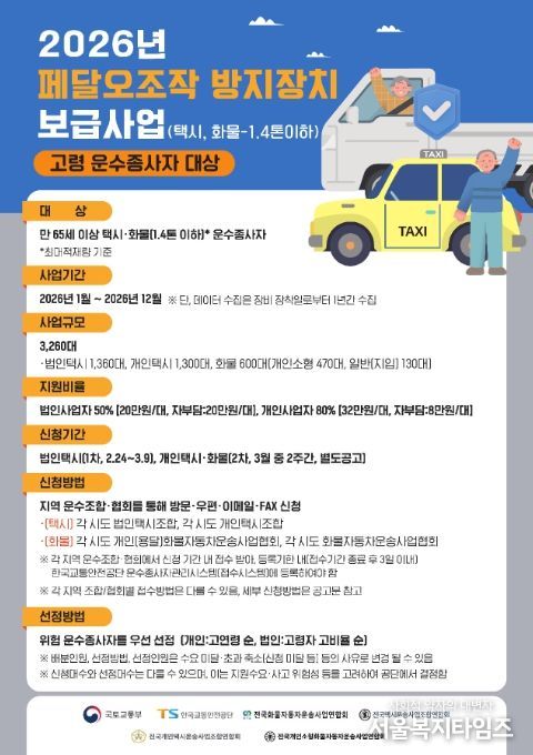 이번 사업은 만 65세 이상 택시 및 화물차량(최대적재량 1.4톤 이하) 운수종사자 대상으로 추진하며, 1차 공고는 법인택시를 대상으로 2월 24일부터 3월 9일까지 각 시도 법인택시조합을 통해 접수한다.