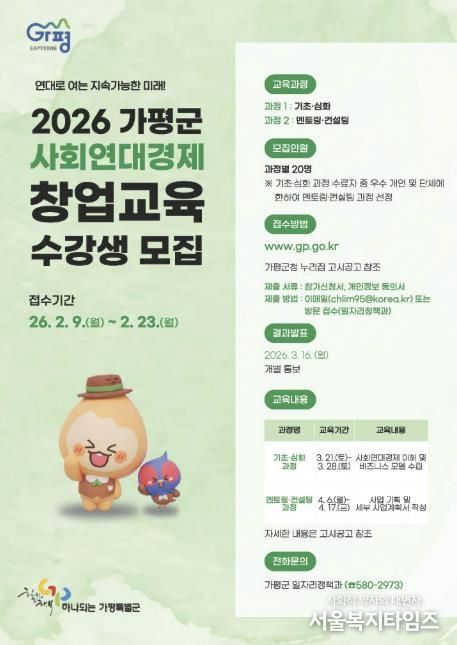 군은 ‘2026년 사회연대경제 창업교육’ 수강생을 이달 9일부터 23일까지 각 과정별로 20명씩 모집한다고 10일 밝혔다. 이번 창업교육은 사회연대경제에 관심 있는 가평군민을 대상으로 하며, 3월 21일부터 4월 17일까지 총 8회에 걸쳐 진행된다.