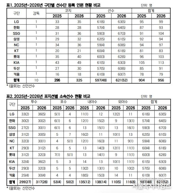 서울복지타임즈 이재연 기자 | KBO는 2월 10일(화) 2026년 KBO 리그 소속 선수 명단을 공시했다. 10개 구단은 총 621명의 선수를 등록해, 597명이 등록했던 2025년보다 24명이 늘어났다.