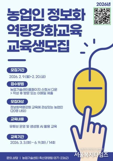 서울복지타임즈 이재연 기자 | 음성군농업기술센터는 농업인의 디지털 활용 능력과 온라인 홍보 역량 강화를 위해 ‘2026년 농업인 정보화 역량강화교육’ 교육생을 모집한다.