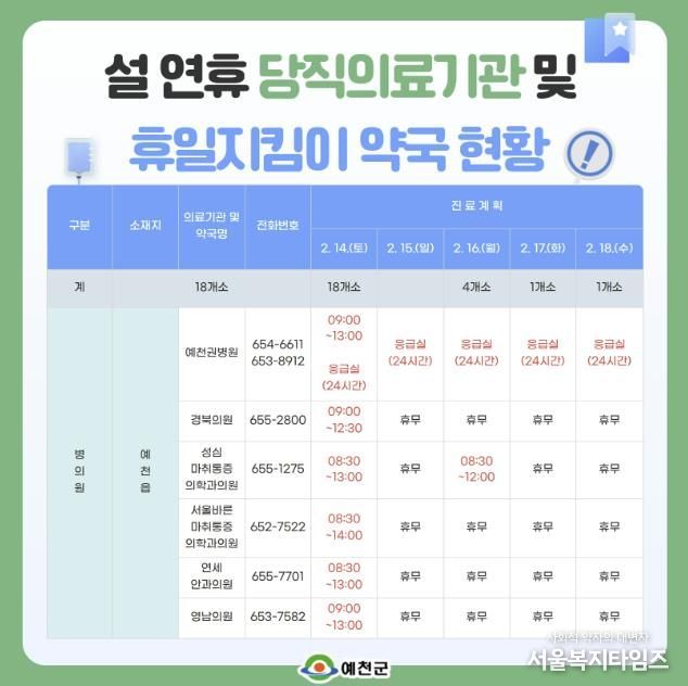 서울복지타임즈 이재연 기자 | 예천군은 설 연휴 동안 관내 병․의원 당직의료기관과 휴일 지킴이 약국을 운영해 진료 편의와 응급진료 서비스를 제공한다.