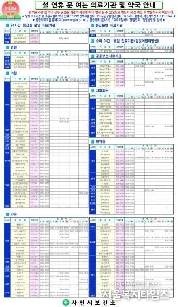 또한, 어린 자녀를 둔 부모들의 불안을 해소하기 위해 '달빛어린이병원'인 사천서울아동병원은 설 당일(2월 17일)을 제외한 연휴 기간 내내 운영되어 소아 경증 환자에게 신속한 의료서비스를 제공할 예정이다.
