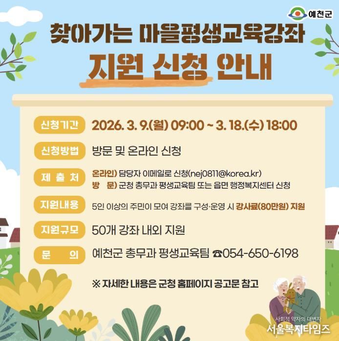 서울복지타임즈 이재연 기자 | 예천군은 3월 9일부터 3월 18일까지 2026년 ‘찾아가는 마을평생교육강좌’ 참여 희망자를 모집한다.