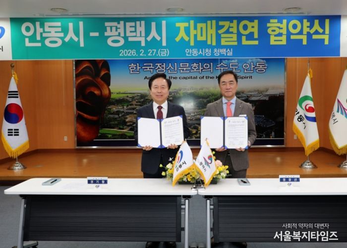 서울복지타임즈 이재연 기자 | 안동시는 2월 27일 안동시청에서 평택시와 자매결연 협약을 체결하고 경제․문화․관광‧농업 등 전 분야에 걸친 상생발전의 닻을 올렸다.