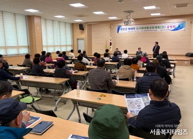 서울복지타임즈 이재연 기자 | 무안군은 해제면 도시재생 활성화계획(안)에 대한 공청회를 주민과 관계 전문가 등 60여 명이 참석한 가운데 지난 6일 해제면 주민다목적센터 강당에서 개최했다고 밝혔다.