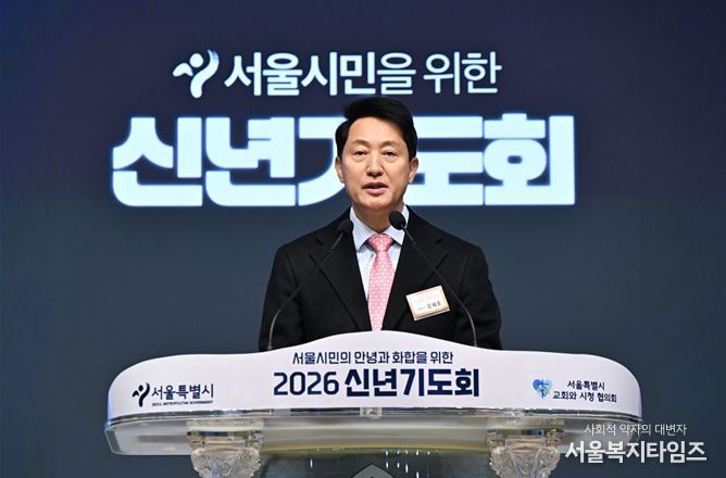 서울복지타임즈 이재연 기자 | 오세훈 서울시장은 9일 오전 7시 20분, 신길교회(영등포구 영등포로67가길 9)에서 서울특별시교회와시청협의회 주최로 열린 ‘2026 신년기도회’에 참석해 서울 시민의 안녕과 화합을 위해 기도했다.