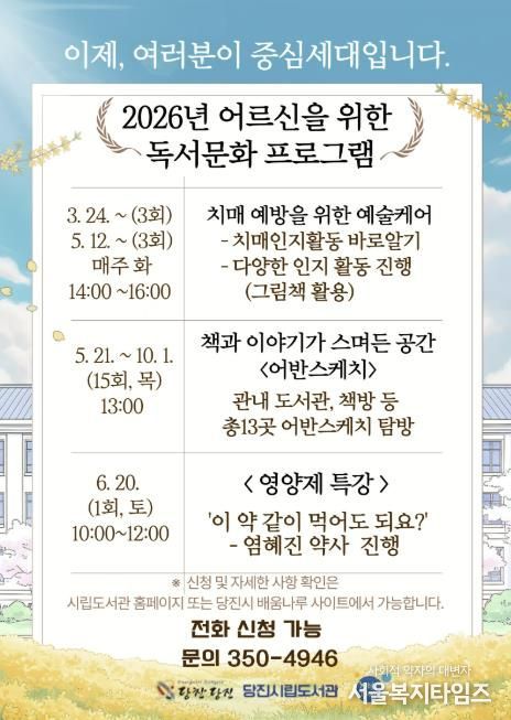 서울복지타임즈 이재연 기자 | 당진시는 어르신들이 책을 매개로 다양한 문화 활동을 경험하며 건강과 삶의 질을 높이기 위해 시립송악도서관에서 어르신 대상 독서문화 프로그램을 운영한다고 10일 밝혔다.