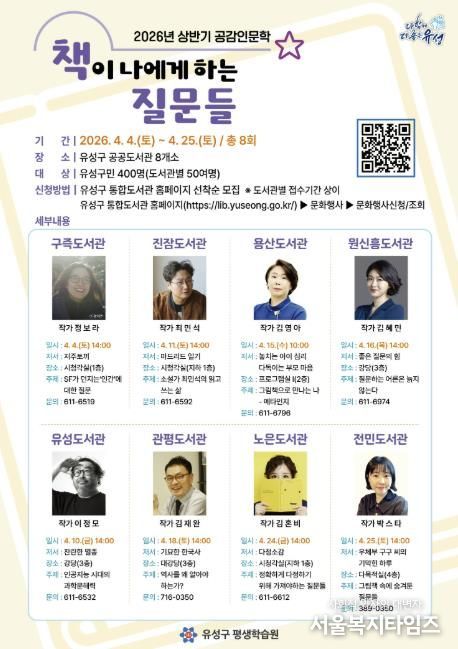 서울복지타임즈 이재연 기자 | 대전 유성구는 4월 한 달간 관내 8개 공공도서관에서 도서관의 날·도서관 주간을 맞아 ‘2026년 상반기 공감인문학 강연’을 운영한다.