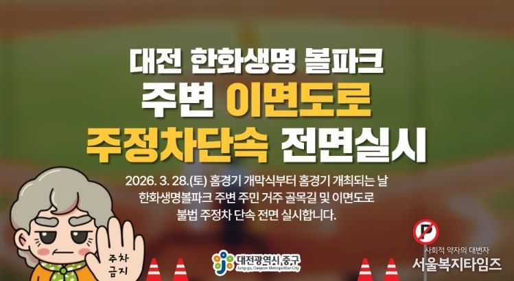 서울복지타임즈 이재연 기자 | 대전 중구는 대전 한화생명 볼파크 야구 홈경기 개막전이 열리는 오는 28일부터‘대전 한화생명 볼파크’주변의 불법주정차 단속을 전면 시행한다고 밝혔다.
