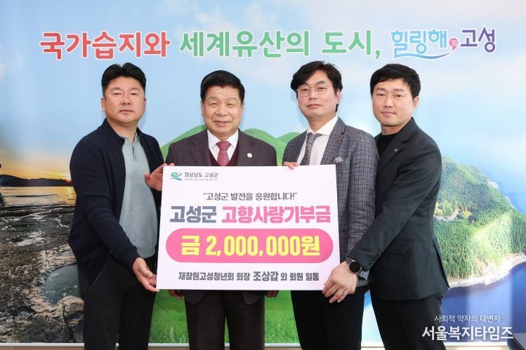 서울복지타임즈 이재연 기자 | 고성군은 재창원고성청년회 회원 일동(회장 조상갑)이 고향 고성을 응원하는 마음을 담아 고향사랑기부금 200만 원을 기탁했다고 밝혔다.