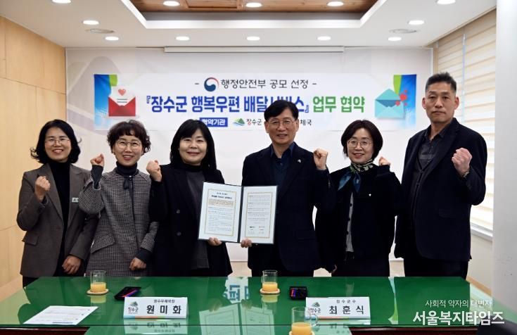 장수군은 이번 사업의 성공적인 추진을 위해 장수우체국과 협력체계를 구축하는 업무협약도 함께 체결하고, 복지 사각지대에 놓인 취약계층을 보다 촘촘하게 돌보기 위한 민‧관 협력 기반을 강화했다.
