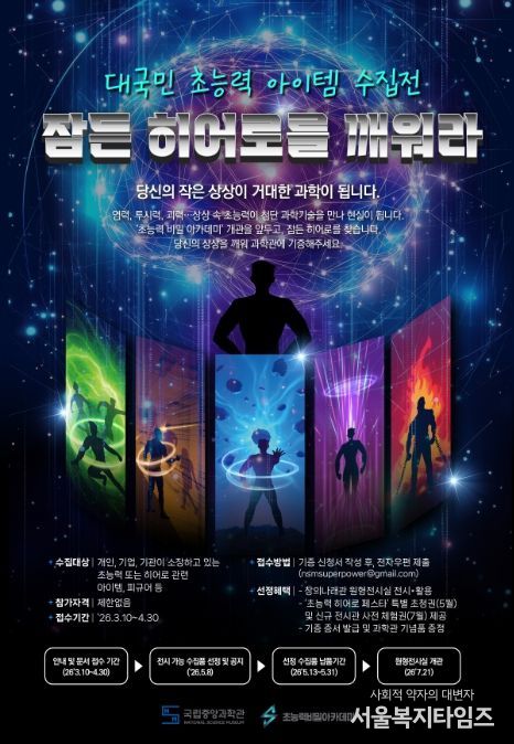 서울복지타임즈 이재연 기자 | 미래의 꿈을 만드는 과학 기술 문화 이음터(플랫폼) 과학기술정보통신부 국립중앙과학관은 창의 나래관 신규 전시관 개관을 앞두고, 대국민 참여형 전시인 ‘초능력 품목(아이템) 수집전: 잠든 영웅(히어로)을 깨워라’를 3월 10일부터 시작한다고 밝혔다.