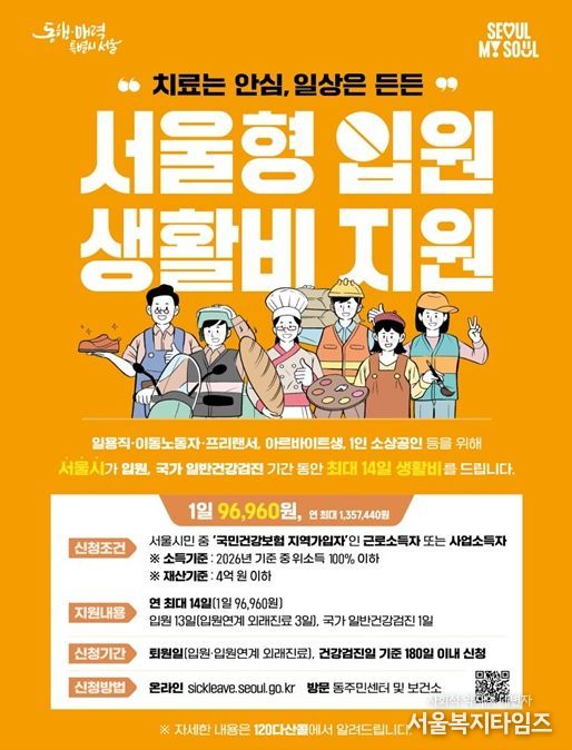 서울복지타임즈 이재연 기자 | 서울시는 일하는 시민이 치료를 위한 입원이나 건강검진으로 발생하는 소득 공백을 지원하는 ‘서울형 입원생활비 지원’ 사업의 지원 기준을 완화하고 1일 지원 금액을 96,960원으로 확대한다고 밝혔다.