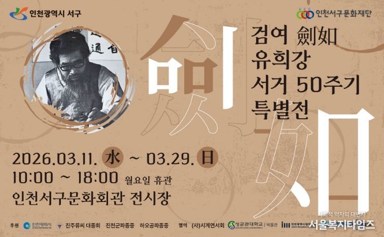 서울복지타임즈 이재연 기자 | (재)인천서구문화재단은 오는 3월 11일부터 3월 29일까지 인천서구문화회관 전시장에서 ‘검여 유희강 선생 50주기 기념 특별전’을 개최한다.