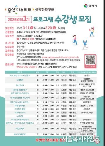 서울복지타임즈 이재연 기자 | 양산시는 오는 3월 11일부터 20일까지 10일간 ‘2026년 제1기 증산다누리터 생활문화센터’시민 문화강좌 수강생을 모집한다.