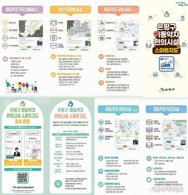 지도에는 경사로가 설치된 상점, 장애인 거주시설, 장애인 친화미용실, 전동휠체어 충전소 등 총 14종의 다양한 편의시설 정보가 담겨있다. 또한 무료 셔틀버스, 아이맘택시, 은평모두로, 백세콜 등 다양한 교통서비스 안내를 함께 제공해 이동 약자의 편의를 높였다.