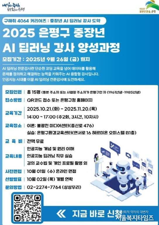 서울복지타임즈 이재연 기자 | 서울 은평구는 중장년층의 경력전환과 창직(創職)을 지원하기 위해 ‘구해줘 4064 커리어즈 시즌2: AI 인공지능(딥러닝) 교육 전문가 양성과정’ 참여자를 모집한다고 밝혔다.