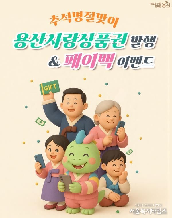 서울복지타임즈 이재연 기자 | 서울 용산구는 추석 명절을 맞아 오는 9월 16일 오전 9시, ‘용산사랑상품권’ 110억 원을 발행한다고 밝혔다. 상품권은 ‘서울페이플러스(서울PAY+)’ 앱을 통해 구매할 수 있으며, 용산구 내 서울페이 가맹점에서 사용 가능하다.