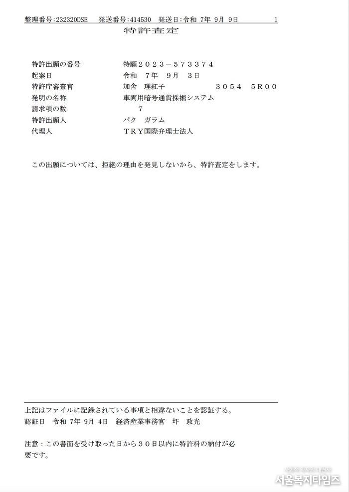 서울복지타임즈 이재연 기자 | 차량에서 버려지는 잉여전력을 모아 2차 배터리로 저장하고 전력소모가 많은 암호화폐채굴시스템에 적용하여 획기적인 주목을 받고 있는 (주) 브이엠에스코리아 박가람(미국명 앤디박) 대표이사가 한국, 미국, 호주에 이어 일본특허등록 결정을 받았다.