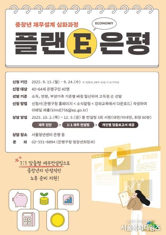 서울복지타임즈 이재연 기자 | 서울 은평구는 중장년의 안정적인 노후 준비 지원을 위해 1:1 맞춤형 재무컨설팅 ‘플랜 E 은평’을 운영하고 신청자를 모집한다고 밝혔다.