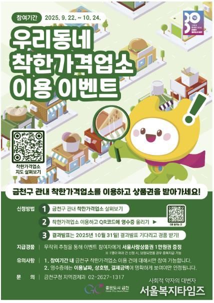 서울복지타임즈 이재연 기자 | 금천구는 착한가격업소 이용 촉진을 위해 22일부터 10월 24일까지 ‘착한가격업소 이용 이벤트’를 진행한다고 밝혔다.