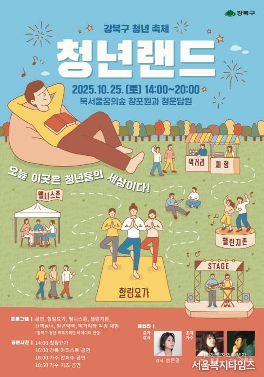 서울복지타임즈 이재연 기자 | 강북구는 오는 10월 25일 북서울꿈의숲에서 열리는 제2회 강북구 청년축제 ‘청년랜드’의 주요 프로그램인 △힐링요가 △웰니스존 △산책남녀의 참여자를 9월 22일(월)부터 사전 모집한다.