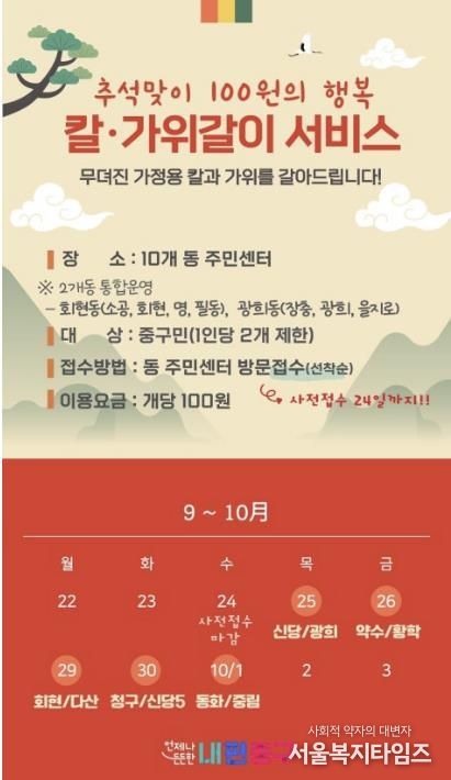 서울복지타임즈 이재연 기자 | 서울 중구가 오는 25일부터 10월 1일까지 동을 순회하며 ‘찾아가는 칼·가위갈이 서비스’를 운영한다. 음식 준비로 칼과 가위 사용이 잦아지는 추석 명절을 맞이해, 중구가 고향사랑기금으로 마련한 생활밀착형 서비스다.