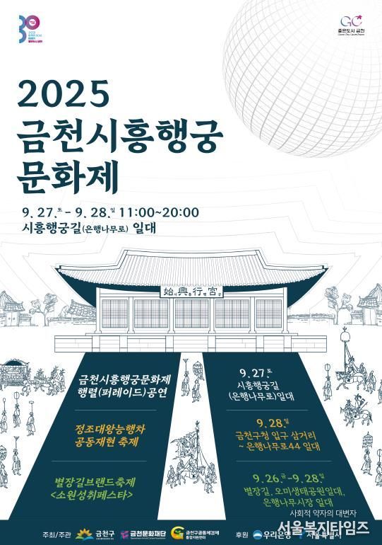 서울복지타임즈 이재연 기자 | 금천구와 금천문화재단은 27일과 28일 양일간 금천구 은행나무로 일대에서 ‘2025 금천시흥행궁문화제’를 개최한다고 밝혔다. 인근에서 하루 전날인 26일부터 지역 대표 축제인 ‘2025 별장길 브랜드 축제(부제: 소원성취페스타 소·성·페)‘도 열려 축제의 한마당이 펼쳐질 것이라고 구는 설명했다.