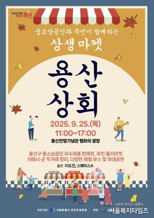 서울복지타임즈 이재연 기자 | 서울 용산구가 오는 25일 오전 11시~오후 5시 전쟁기념관(이태원로 29) 평화의 광장에서 (사)용산구상공회 주최로 열리는 중소상공인과 주민이 함께하는 상생마켓 ‘용산상회’를 후원한다.
