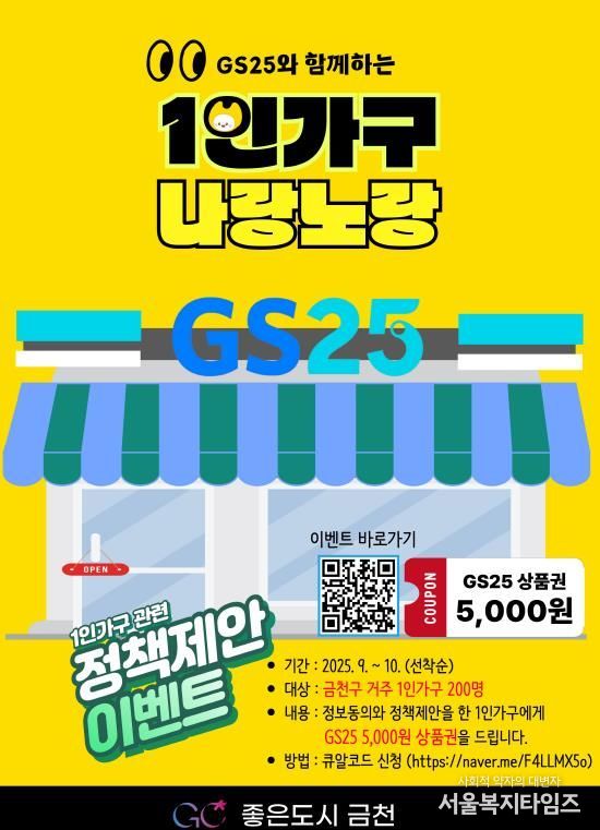 아울러, 홍보존에 삽입된 QR코드를 통해 정보제공에 동의하고 1인가구 정책제안을 한 1인가구 200명에게는 GS25 상품권(5000원권)을 제공하는 이벤트도 진행하고 있다.